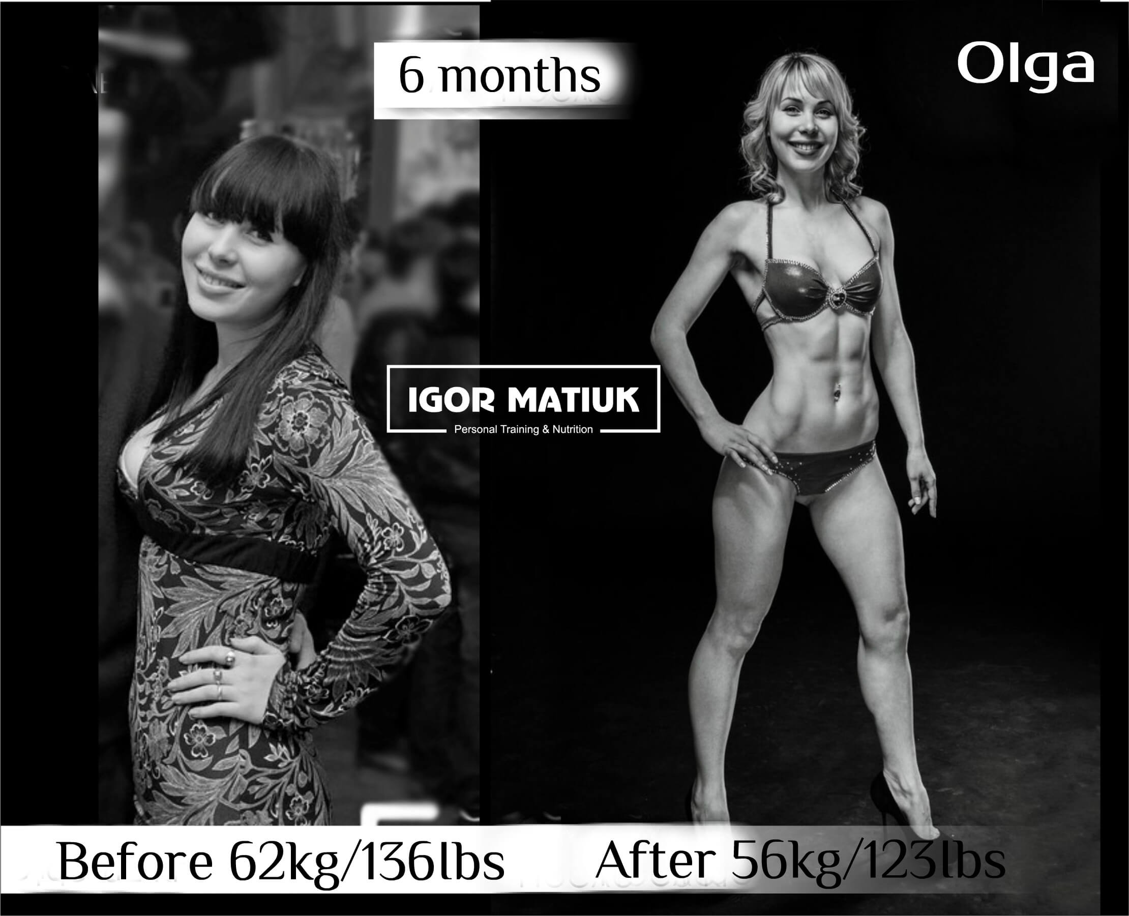 Our initial goal of weight loss has been achieved. Now we can focus on adding muscle, this will build the figure she will need for a photoshoot this summer. It could be called “the body of my dreams” or the one I never imagined I could have (as everyone says in the first class). It is unreal!!! Ahah, I love it. Well done, Olya, let us continue following the plan.