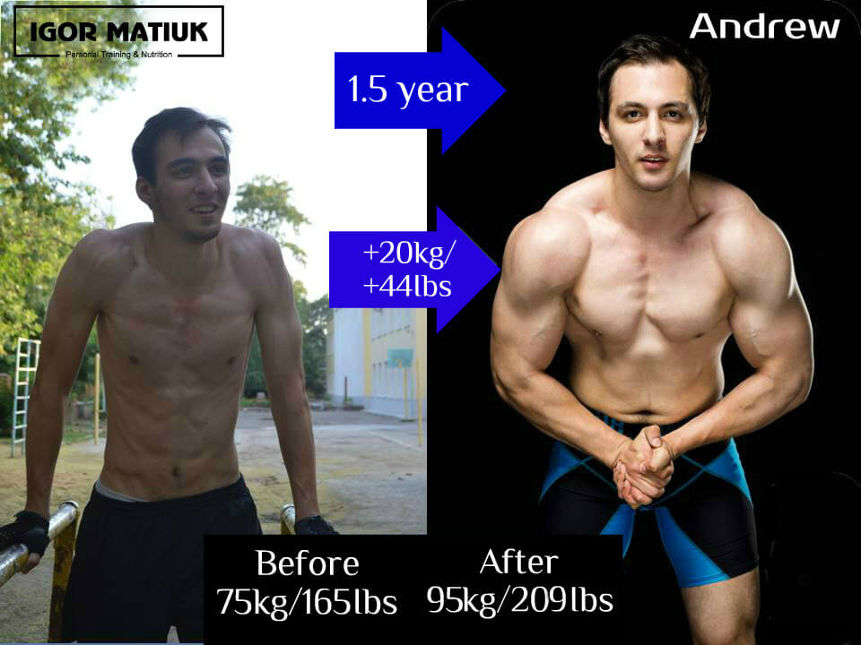Andrey and I have trained together for over 1 and half years, 3-4 times a week, and during this time he has missed perhaps only 15 training sessions. Taking into consideration the illness and other troubles. He is always in a good mood and has a creative impulse, he just did everything that the trainer asked of him with 100% effort, completely trusting me. Some sports nutrition accompanied our training, like I say, food is the basis of everything! A trainer can plan the diet and the training process correctly and confidently.